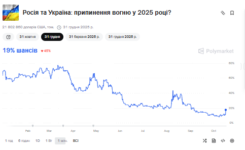 По данным Polymarket по состоянию на 17 октября 2025 года, вероятность прекращения огня на войне в Украине в 2025 году составила 19%. Этот показатель существенно выше, чем в предыдущие недели, когда шансы на окончание боевых действий оценивались в пределах 9-10%.
